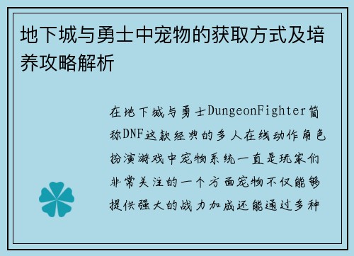 地下城与勇士中宠物的获取方式及培养攻略解析